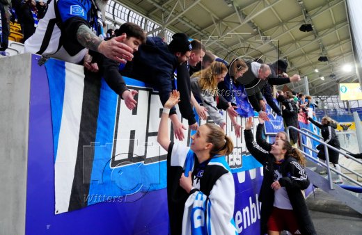 v.l. Victoria Schulz, Melanie Brunnthaler (HSV) bei den Fans
