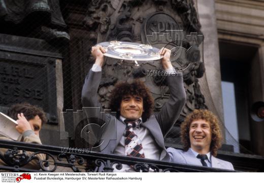 v.l. Kevin Keegan mit Meisterschale, Torwart Rudi Kargus