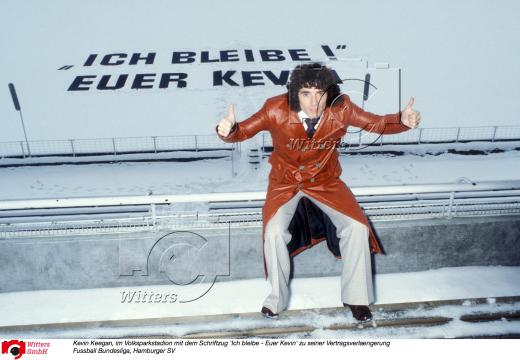 Kevin Keegan, im Volksparkstadion mit dem Schriftzug 'Ich bleibe - Euer Kevin' zu seiner Vertragsverlaengerung