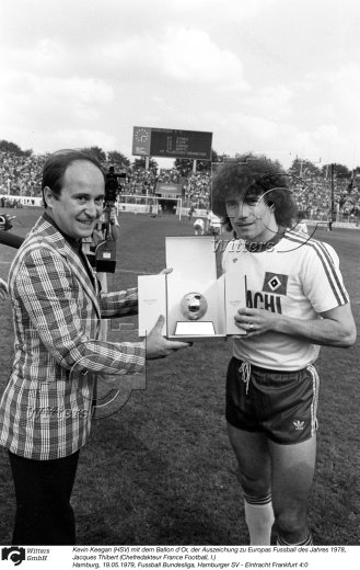 Kevin Keegan (HSV) mit dem Ballon d'Or, der Auszeichung zu Europas Fussball des Jahres 1978, Jacques Thibert (Chefredakteur France Football, l.)