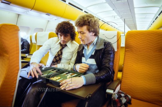 v.l. Kevin Keegan, Hans-Guenther Pluecken (HSV) spielen Backgammon waehrend des Fluges zum Testspiel nach Paris