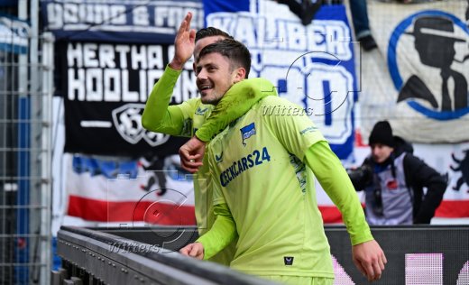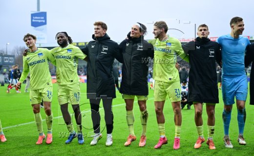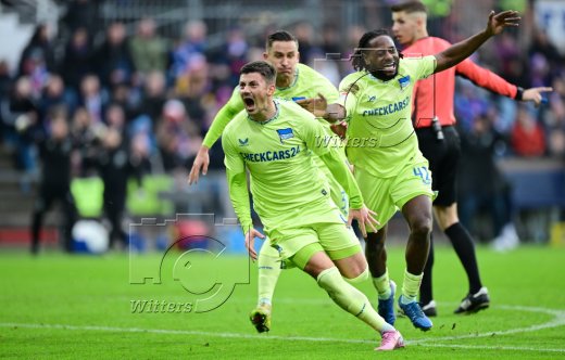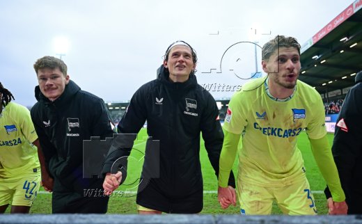Schlussjubel, v.l. Luca Schuler, Fabian Reese, Marton Dardai (Hertha)
