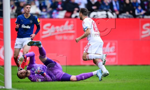 1:2 Tor, v.l. Torschuetze Adrian Kapralik (Kiel), Adam Markhiev, Tom Baack, Torwart Jan Reichert (Nuernberg)