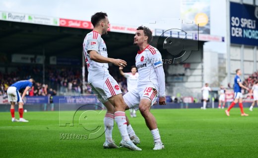 0:1 Tor, Jubel, v.l. Torwart Timon Weiner (Kiel), Torschuetze Julian Justvan (Nuernberg)
