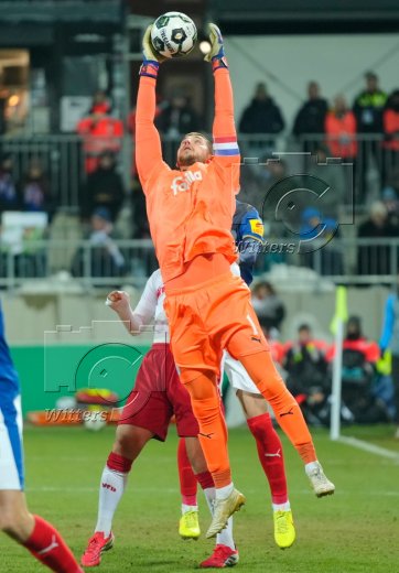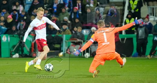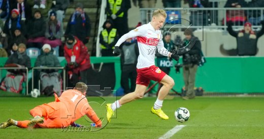 Zum 0:2 Tor, v.l. Torschuetze Chris Fuehrich (Stuttgart), Torwart Timon Weiner (Kiel)