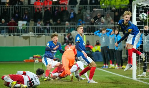 0:1 Tor, v.l. Phil Harres, Torwart Timon Weiner (Kiel), Torschuetze Deniz Undav (Stuttgart), Marko Ivezic, Kasper Davidsen