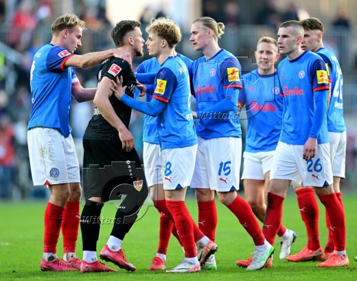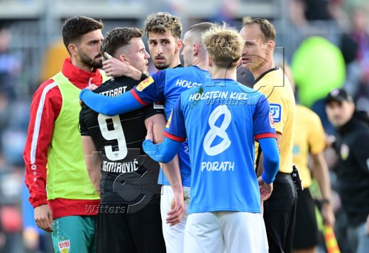 Streit v.l. Ermedin Demirovic, Atakan Karazor (Stuttgart),m David Zec, Finn Porath (Kiel), Schiedsrichter Bastian Dankert