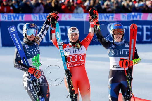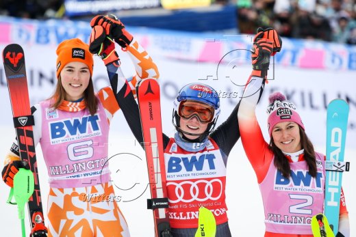 v.l. Petra Vlhova (Slowakei, 2. Platz), Siegerin Mikaela Shiffrin (USA), Wendy Holdener (Schweiz, 3. Platz)