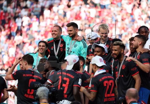 FC Bayern Muenchen Deutscher Meister 2023, v.l. Thomas Mueller, Arijon Ibrahimovic, Leon Goretzka (oben), Torwart Manuel Neuer, Bouna Sarr, Dayot Upamecano, Joshua Kimmich, Benjamin Pavard, Eric Maxim Choupo-Moting, Jamal Musiala, Ryan Gravenberch
