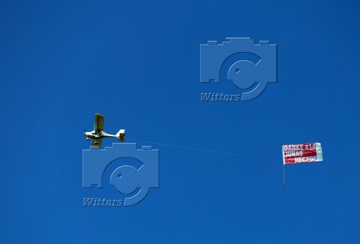 Flugzeug mit Transparent zur Verabschiedung von Joans Hector (Koeln)