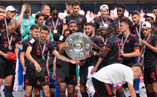 FC Bayern Muenchen Deutscher Meister 2023, v.l. Matthijs de Ligt, Thomas Mueller, Eric Maxim Choupo-Moting mit Meisterschale, Noussair Mazraoui, Dayot Upamecano, Sadio Mane, Benjamin Pavard, Jamal Musiala
