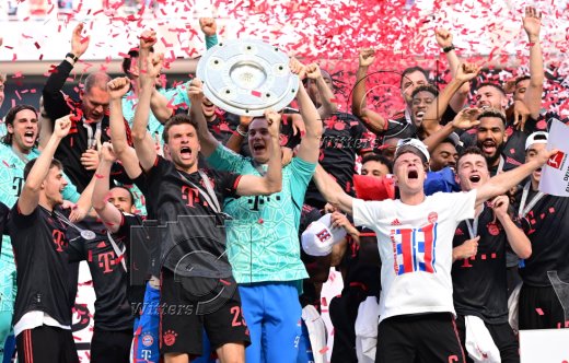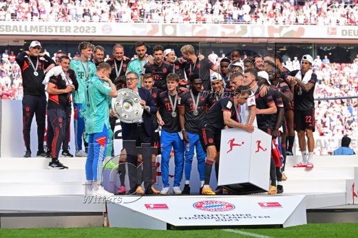 FC Bayern Muenchen Deutscher Meister 2023, vorn v.l. Josip Stanisic, Thomas Mueller, Torwart Manuel Neuer (Bayern) mit der Meisterschale, Joshua Kimmich, Benjamin Pavard, Dayot Upamecano, Jamal Musiala