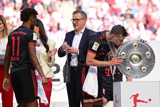 FC Bayern Muenchen Deutscher Meister 2023, v.l. Kingsley Coman, DFL-Praesidiumsmitglied Jan-Christian Dreesen (Bayern Vorstand), Benjamin Pavard kuesst die Meisterschale