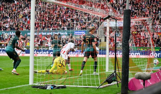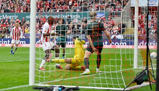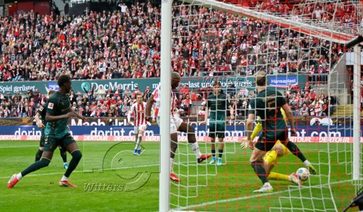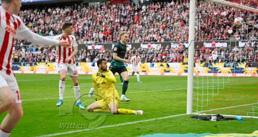 3:1 Tor, v.l. Torschuetze Isak Johannesson (Koeln), Marius Buelter, Torwart Mio Backhaus (Bremen), Amos Pieper