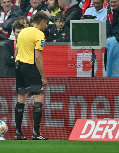 Schiedsrichter Tobias Reichel schaut sich Videobeweis an