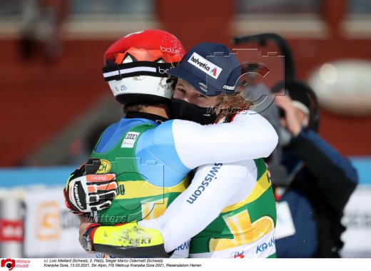 v.l. Loic Meillard (Schweiz, 2. Platz), Sieger Marco Odermatt (Schweiz)