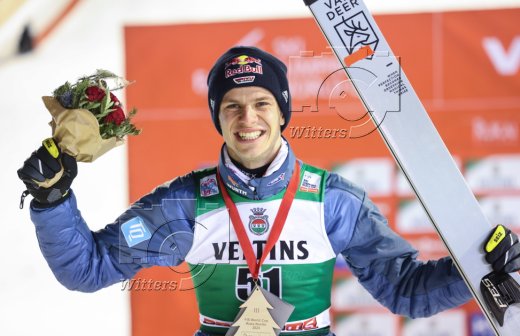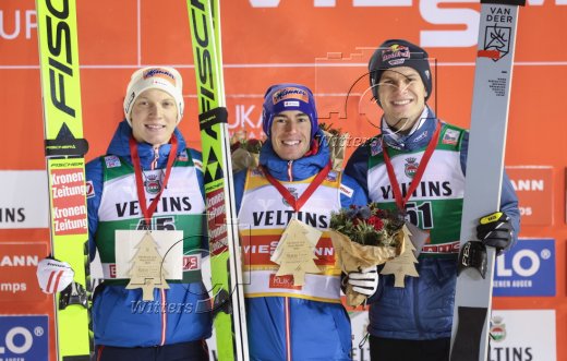 v.l. Jan Hoerl (Oesterreich, 2. Platz), Sieger Stefan Kraft (Oesterreich), Andreas Wellinger (Deutschland, 3. Platz)