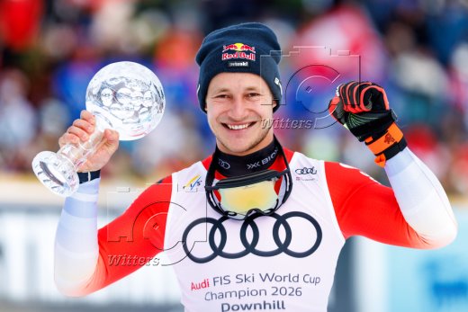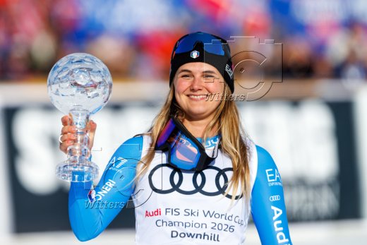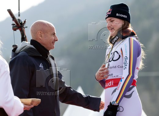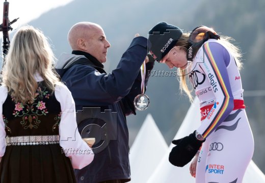 Siegerehrung Weltcup-Gesamtsieg Abfahrt, v.l. FIS-Praesident Johann Eliasch, Emma Aicher (Deutschland., 2. Platz)