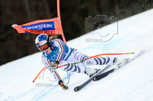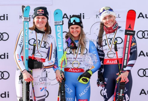 v.l. Breezy Johnson (USA, 2. Platz), Siegerin Laura Pirovano (Italien), Kira Weidle-Winkelmann (Deutschland, 3. Platz)