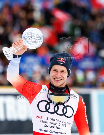 Marco Odermatt (Schweiz), Weltcup-Gesamtsieger Abfahrt, mit kleiner Kristallkugel