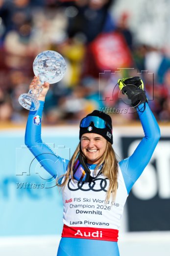 Siegerehrung Weltcup-Gesamtsieg Abfahrt, v.l. Emma Aicher (Deutschland., 2. Platz), Gesamtsiegerin Laura Pirovano (Italien) mit kleiner Kristallkugel