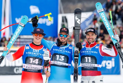 v.l. Franjo von Allmen (Schweiz, 2. Platz), Sieger Dominik Paris (Italien), Vincent Kriechmayr (Oesterreich, 3. Platz)