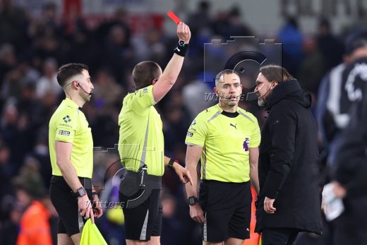 Schiedsrichter Peter Bankes zeigt Trainer Daniel Farke (Leeds) die rote Karte