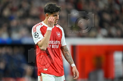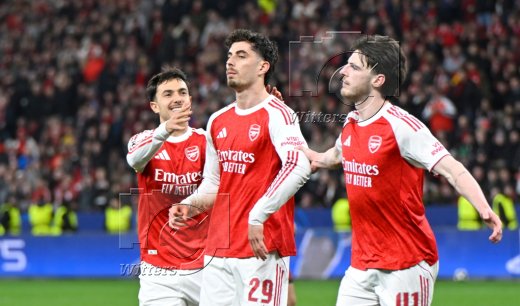 v.l. Trainer Mikel Arteta (Arsenal), Declan Rice, Gabriel Martinelli, Martin Zubimendi