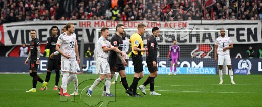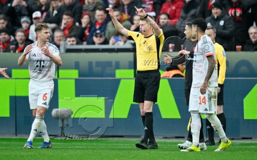 v.l. Joshua Kimmich (Bayern), Schiedsrichter Christian Dingert annulliert das 1:1 Tor von Torschuetze Harry Kane (Bayern) nach Videobeweis, Ezequiel Fernandez (Leverkusen), Luis Diaz