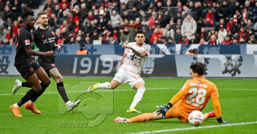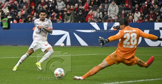 1:1 Tor, v.l. Torschuetze Luis Diaz (Bayern), Torwart Janis Blaswich (Leverkusen)