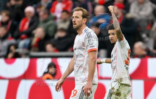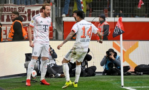 1:1 Tor, Jubel nach Videobeweis annulliert v.l. Torschuetze Harry Kane, Luis Diaz (Bayern)