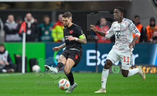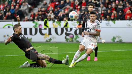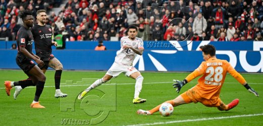 1:1 Tor, v.l. Edmond Tapsoba, Robert Andrich, Torschuetze Luis Diaz (Bayern), Torwart Janis Blaswich (Leverkusen)
