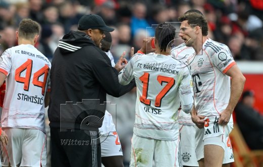 v.l. Josip Stanisic, Trainer Vincent Kompany (Bayern), Michael Olise, Leon Goretzka