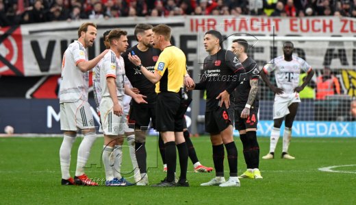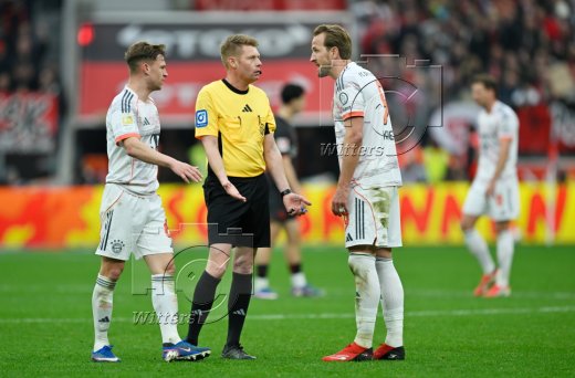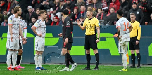 v.l. Harry Kane, Joshua Kimmich (Bayern), Ezequiel Fernandez (Leverkusen), Schiedsrichter Christian Dingert annulliert das 1:1 Tor von Torschuetze Harry Kane (Bayern) nach Videobeweis, Luis Diaz