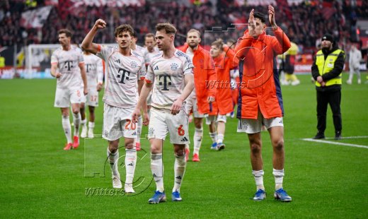 v.l. Tom Bischof, Joshua Kimmich, Aleksandar Pavlovic (Bayern) nach Spielende