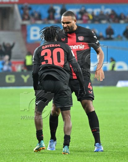 1:1 Tor, Jubel, v.l. Jeremie Frimpong, Jonathan Tah (Leverkusen)