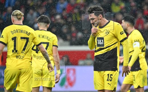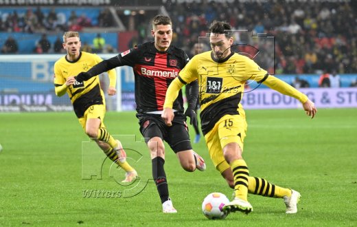 v.l. Jonas Hofmann (Leverkusen), Nico Schlotterbeck, Torwart Gregor Kobel (Dortmund)