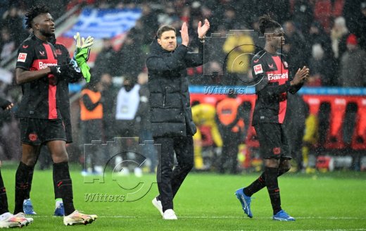 v.l. Jeremie Frimpong, Trainer Xabi Alonso (Leverkusen), Robert Andrich