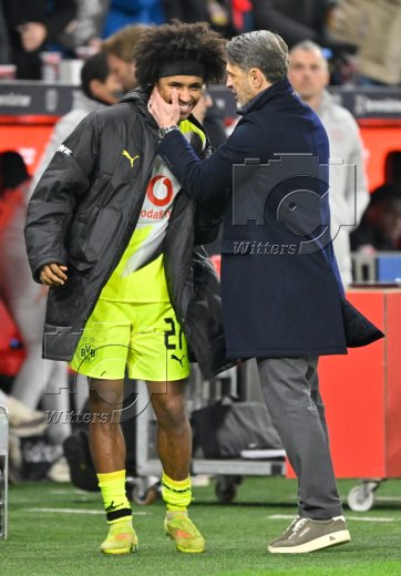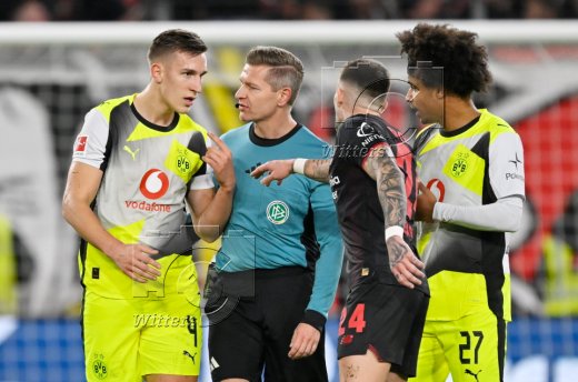 v.l. Nico Schlotterbeck (Dortmund), Schiedsrichter Tobias Welz, Alejandro Grimaldo (Leverkusen), Karim-David Adeyemi