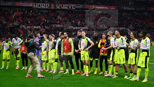 Schlussjubel v.l. Julien Duranville, Trainer Niko Kovac (Dortmund), Torwart Gregor Kobel (Dortmund), Julian Ryerson