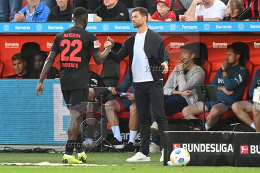 v.l. Victor Boniface, Trainer Xabi Alonso (Leverkusen)