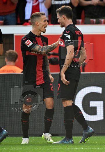 2:1 Tor, Jubel, v.l. Alejandro Grimaldo, Torschuetze Jonas Hofmann (Leverkusen)