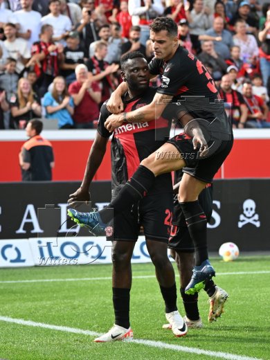 1:0 Tor, Jubel, v.l. Torschuetze Victor Boniface, Granit Xhaka (Leverkusen)