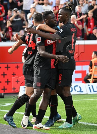 3:1 Tor, Jubel, v.l. Jonas Hofmann, Granit Xhaka, Torschuetze Victor Boniface, Jonathan Tah (Leverkusen)