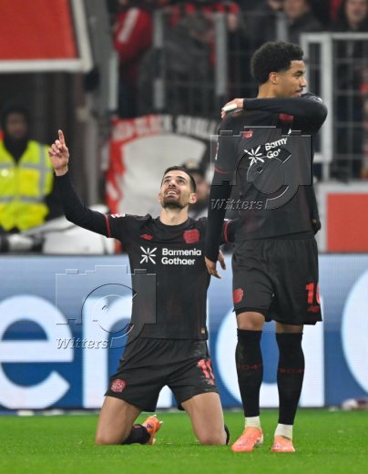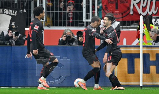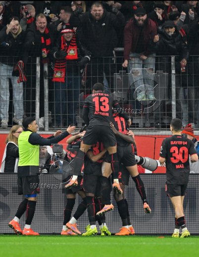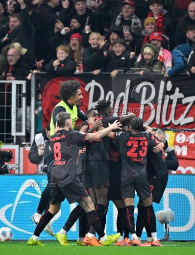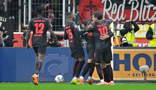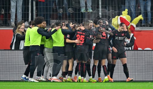 1:0 Tor, Jubel, v.l. Edmond Tapsoba, Christian Kofane, Arthur, Malik Tillmann, Torschuetze Martin Terrier (Leverkusen)