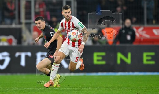 v.l. Linton Maina, Eric Martel, Ragnar Ache, Torschuetze Robert Andrich (Leverkusen), Rav van den Berg (Koeln) nach dem 2:0 Tor