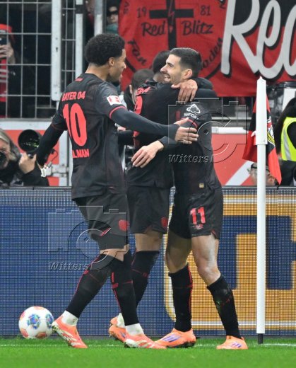 1:0 Tor, Jubel, v.l. Malik Tillmann, Arthur, Torschuetze Martin Terrier (Leverkusen)