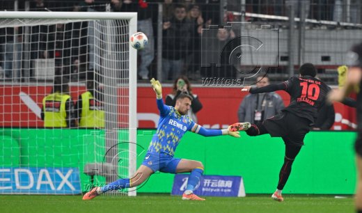 v.l. Torwart Marvin Schwaebe (Koeln), Malik Tillmann (Leverkusen)