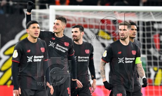 3:0 Tor, Jubel, v.l. Christian Kofane, Robert Andrich, Torschuetze Jonas Hofmann, Ezequiel Fernandez, Arthur (Leverkusen)