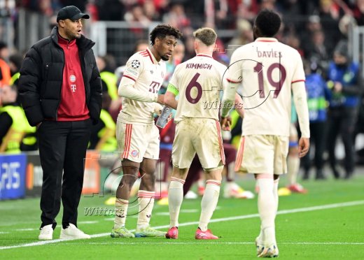 v.l. Trainer Vincent Kompany, Thomas Mueller, Harry Kane (Bayern)